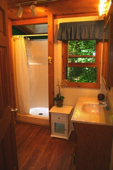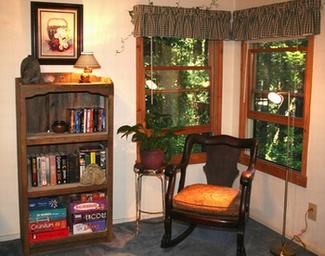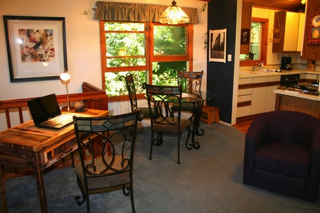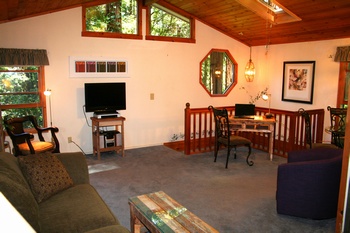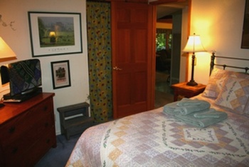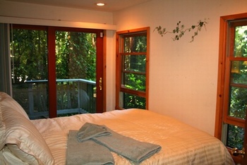 The Master  Suite has a private full bath, gas/log fireplace, cozy sitting area, fantastic views of the forest outside, HDTV w/DVD and cable, a small deck and enclosed dog run...